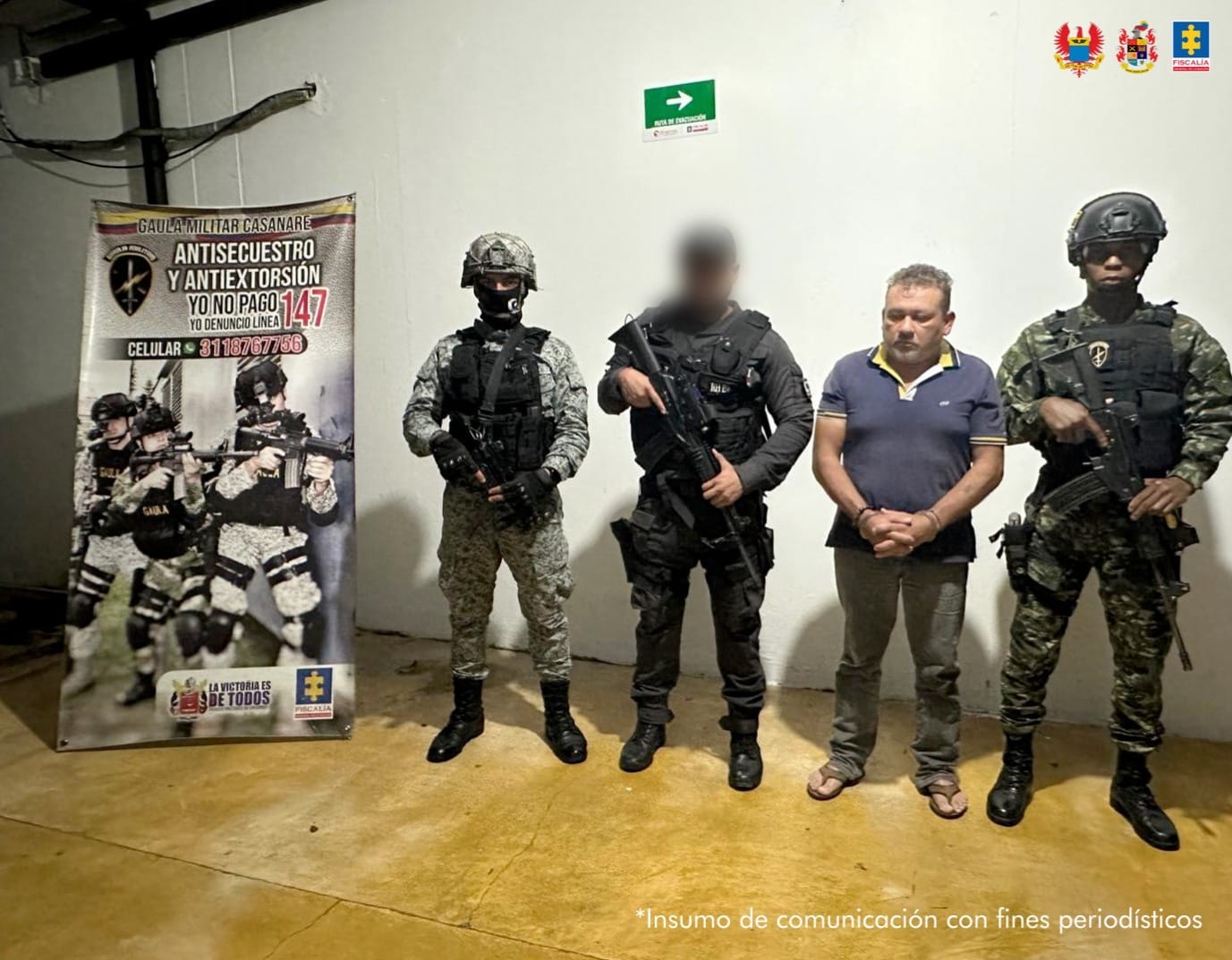 Este hombre fue capturado en Yopal (Casanare), en una diligencia realizada de manera conjunta por el Cuerpo Técnico de Investigación (CTI), unidades del Gaula del Ejército Nacional y la Fuerza Aérea Colombiana. Un fiscal de la Seccional Casanare lo presentó ante un juez de control de garantías y le imputó los delitos de concierto para delinquir con fines extorsivos. El procesado no aceptó los cargos y deberá cumplir medida de aseguramiento en centro carcelario.